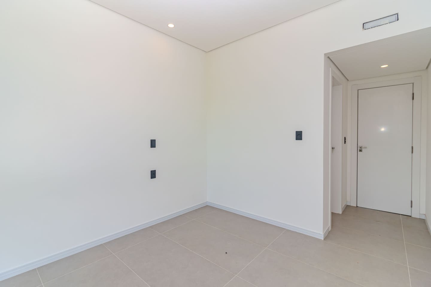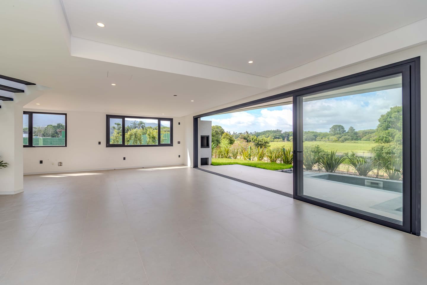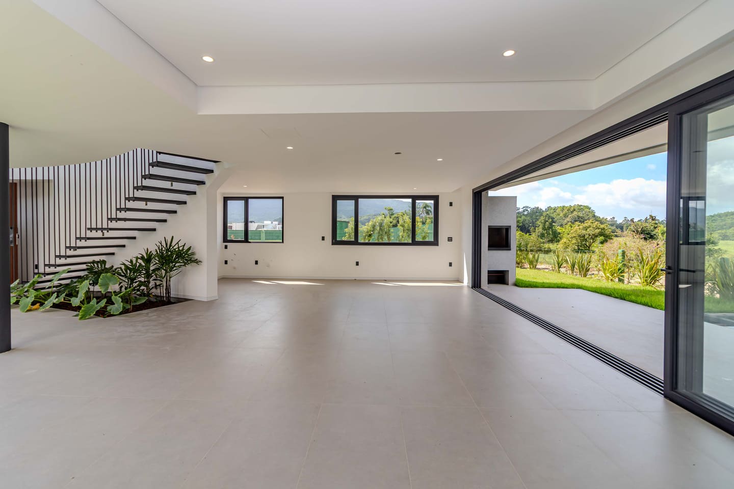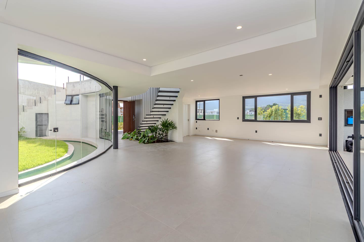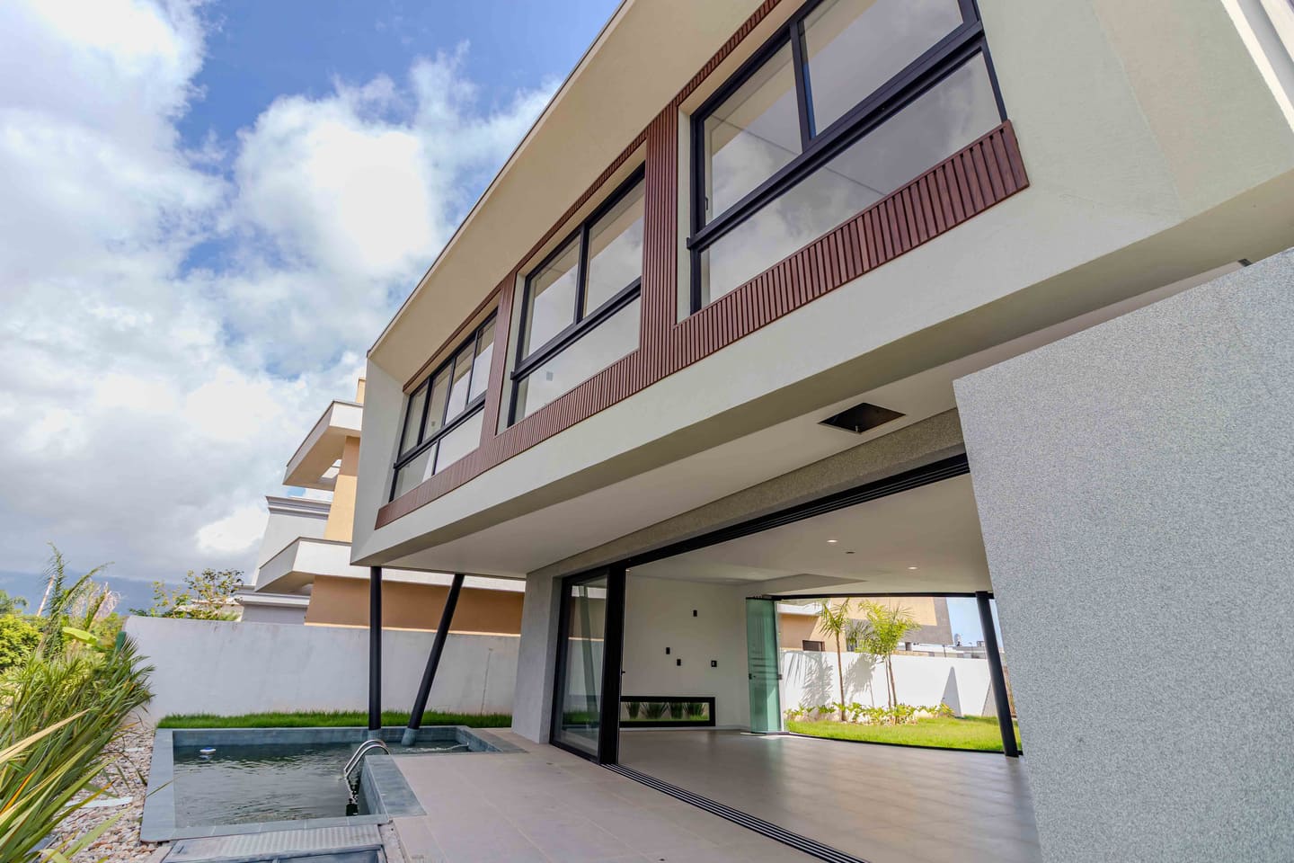 Nível térreo: hall de acesso, jardineira interior/área de contemplação, lavabo, estar diário, jantar, cozinha, lavanderia e apoio para artigos de praia. 1º pavimento: hall íntimo, master suíte, suíte 1, suíte 2 e área íntima. Externas: acesso/garagem, área gourmet com churrasqueira, piscina e espelhos d’água, além de sacada jardim.