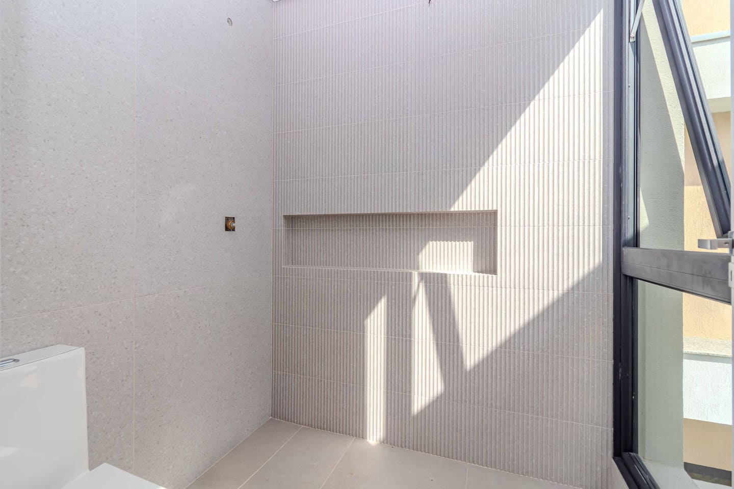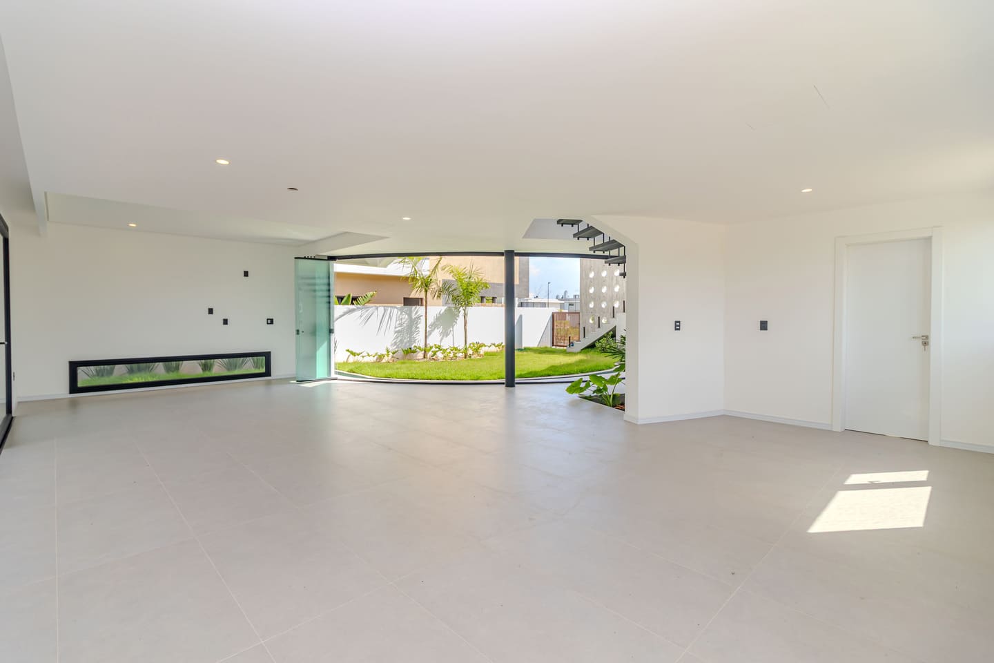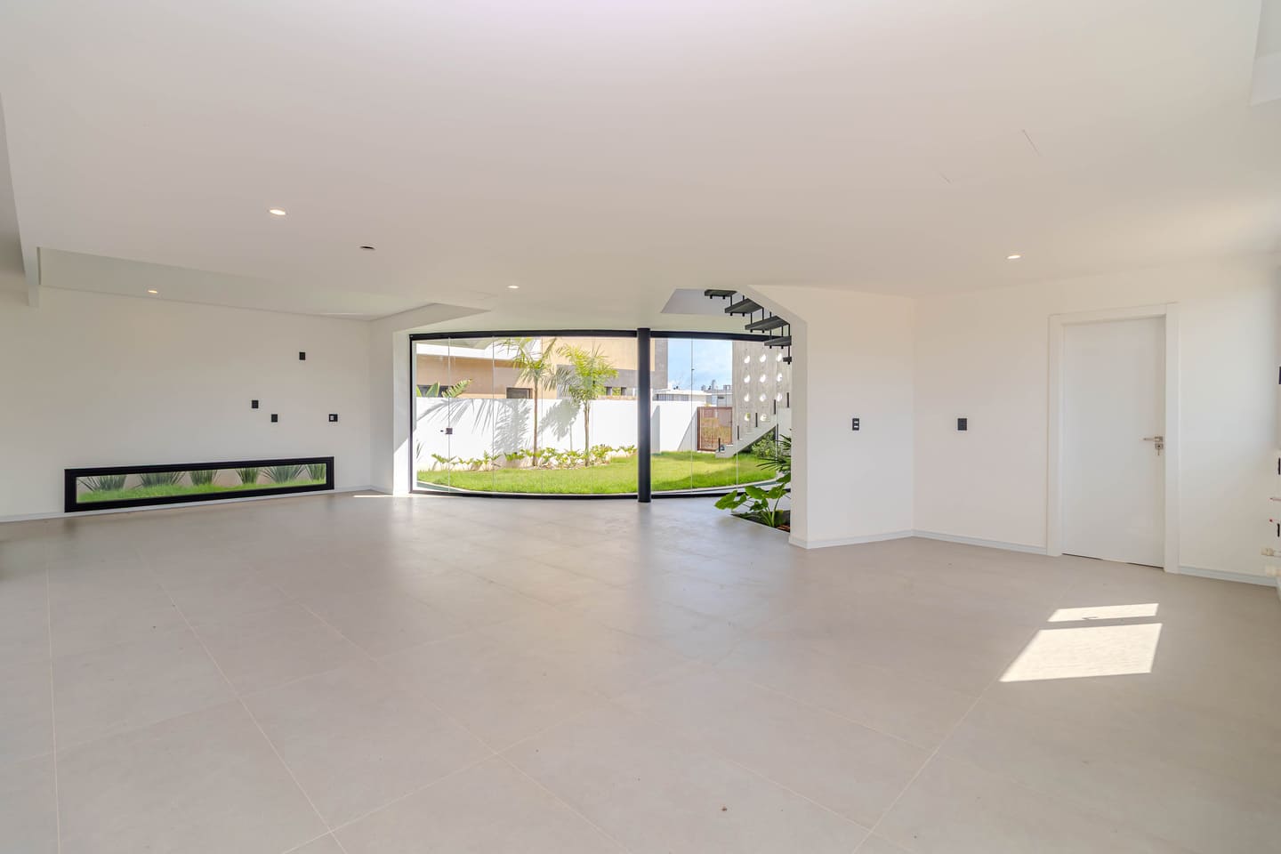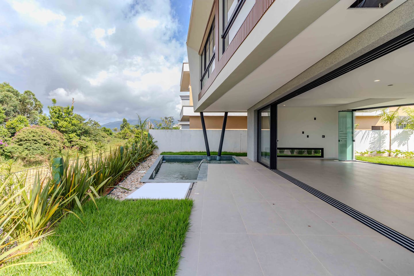 Implantada em lote de 369,97 m², a residência totaliza 350,29 m² de área construída. O térreo integra estar, jantar e cozinha com planos d’água e jardim interno. O pavimento superior abriga as suítes e áreas íntimas, mantendo fluidez e privacidade.