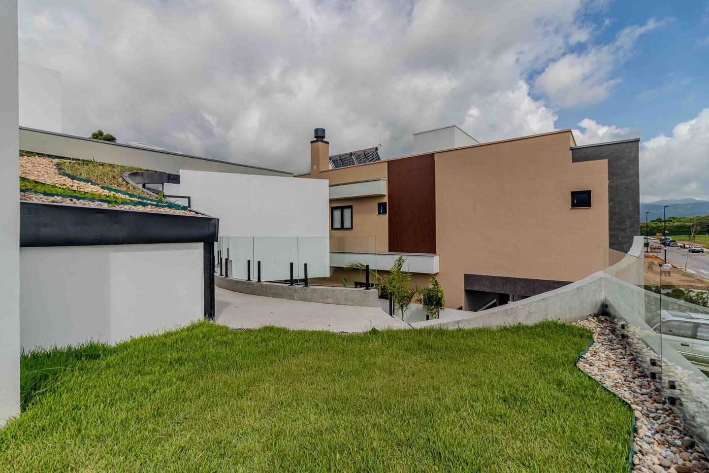 A residência possui 3 suítes e é distribuída em 2 pavimentos (térreo + 1º pavimento), além de áreas externas e cobertura/terraços jardim.