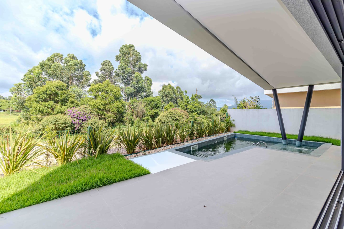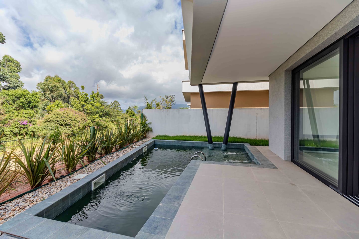 A Casa Möbius integra piscina + espelhos d’água, área gourmet exterior e terraços/jardins, criando transição fluida entre interior e exterior. Os planos d’água ajudam a refrescar e umidificar os espaços e ampliam a sensação de refúgio.
