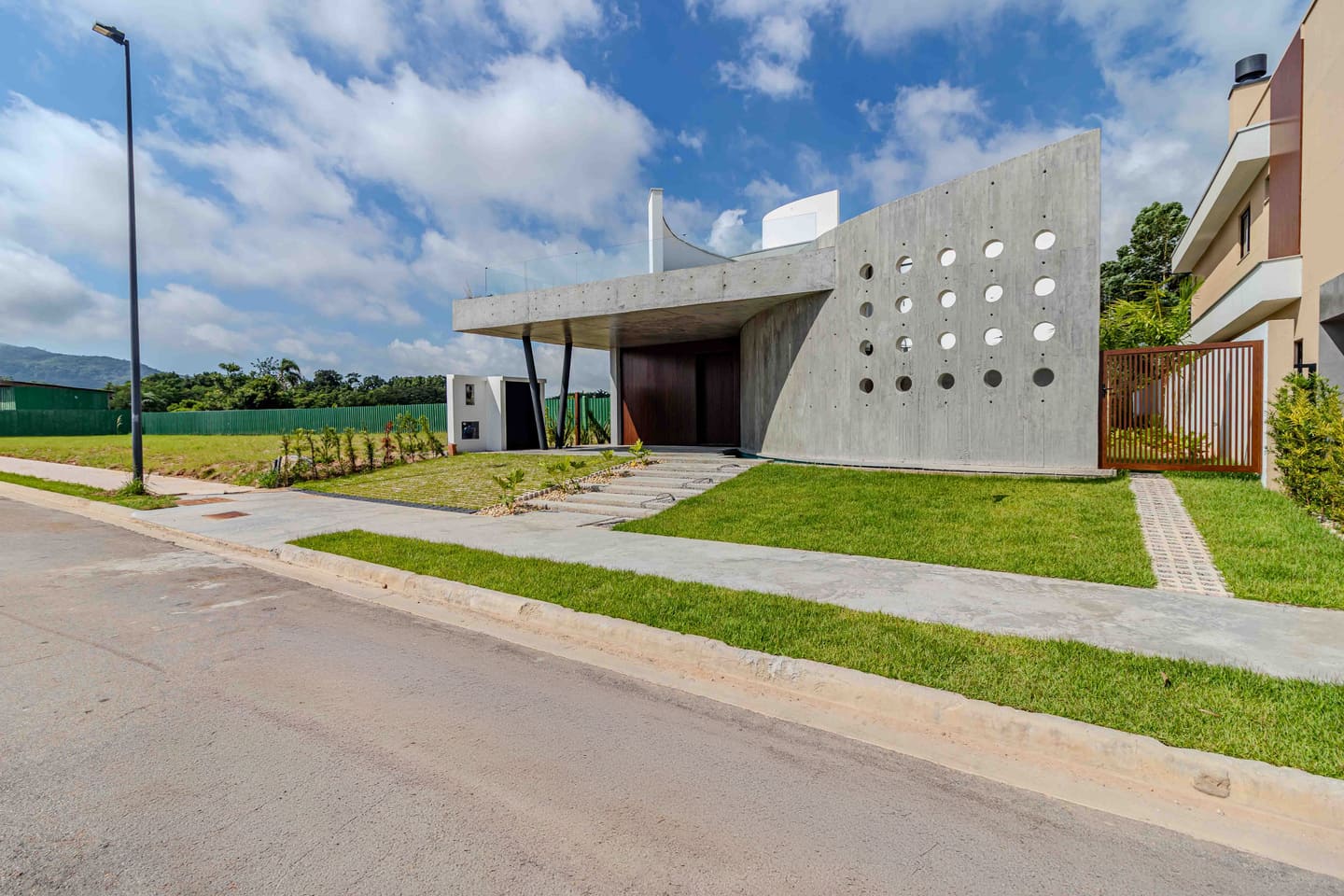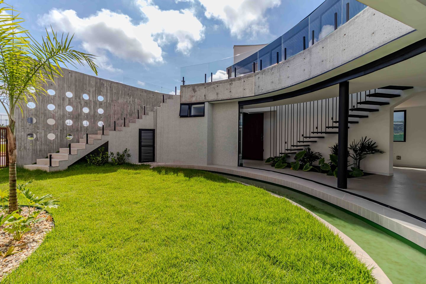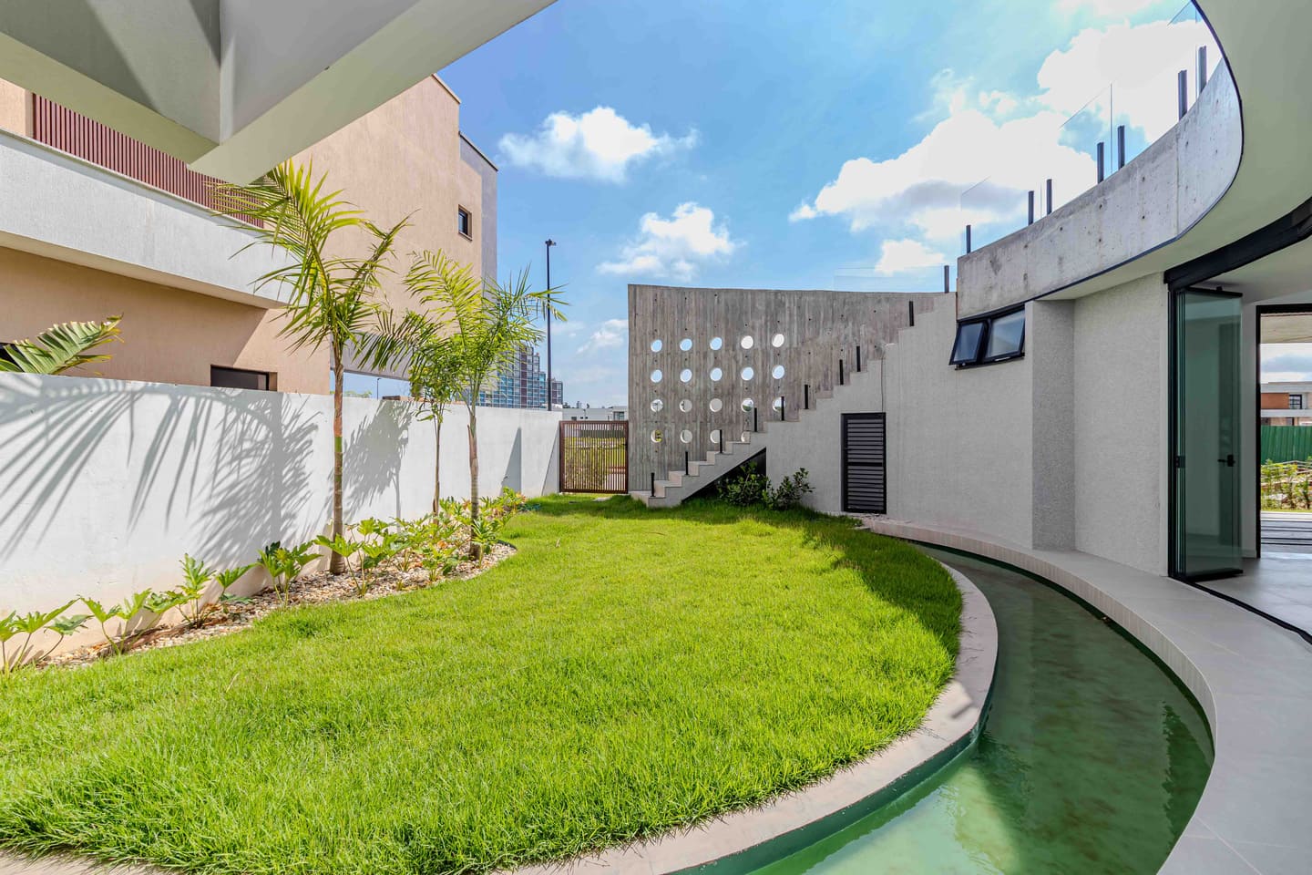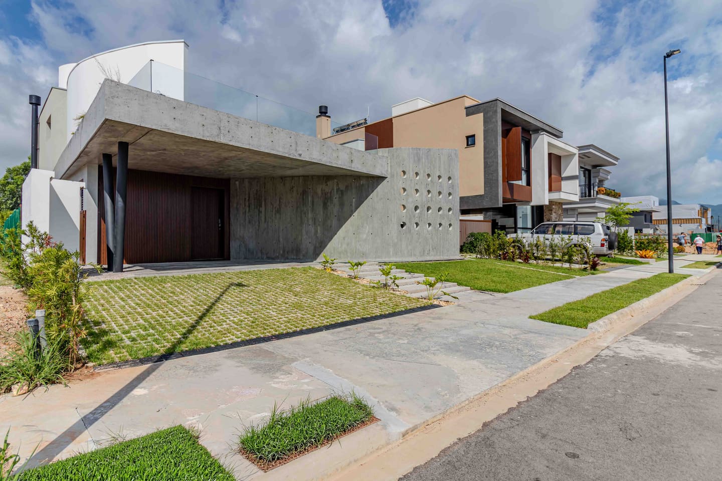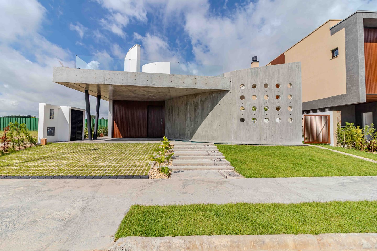 Muros perfurados, terraços jardim, ventilação cruzada e espelhos d’água definem a linguagem. Não é apenas uma residência. É arquitetura autoral em diálogo com a natureza.
