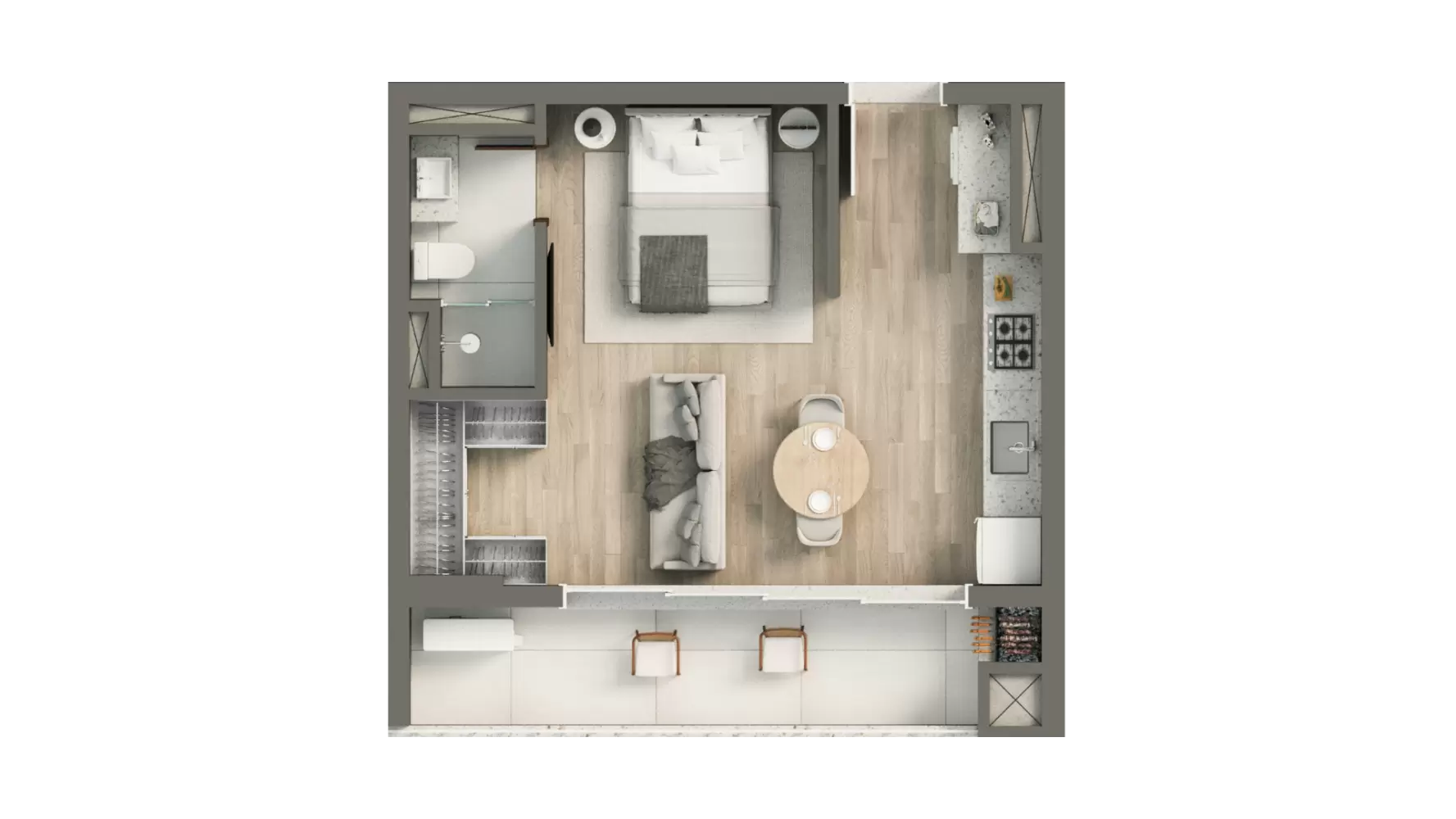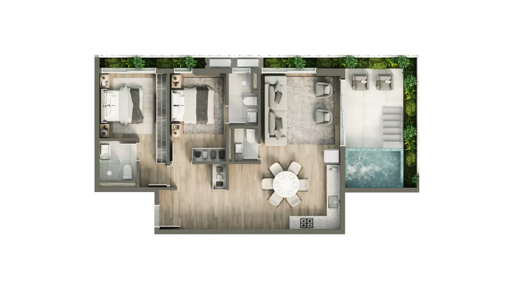 Este apartamento oferece 2 suítes bem distribuídas, um amplo living integrado que valoriza a convivência e a luz natural, além de uma sacada com piscina e terraço, criando um ambiente ideal para relaxar, receber amigos e aproveitar o melhor do seu espaço com liberdade e conforto.